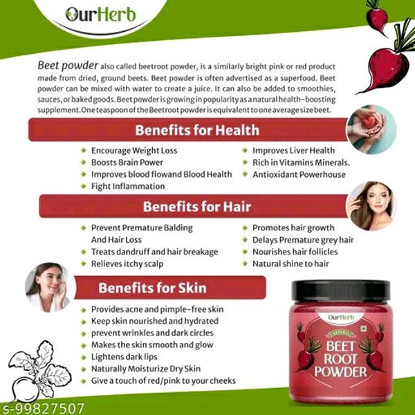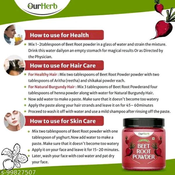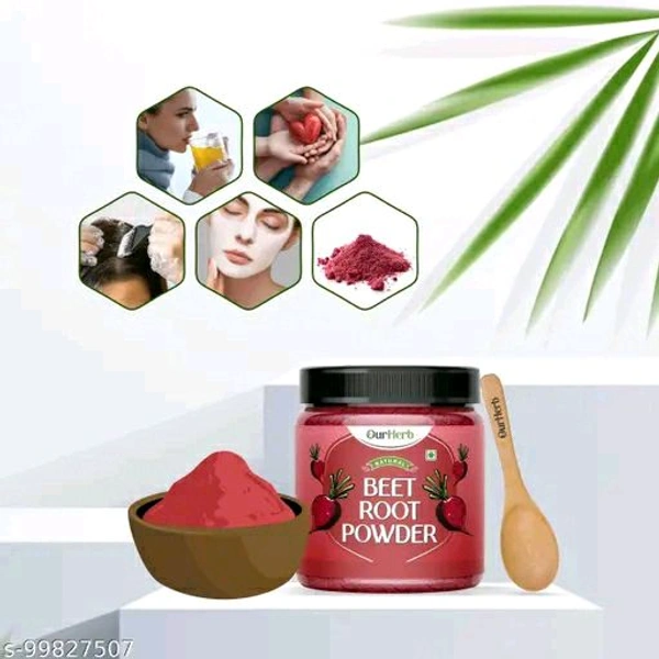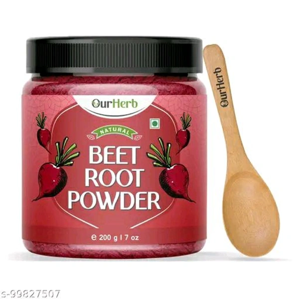 Beetroot powder Beetroot powder for face Hair Pack is 100% natural made using handpicked & organic ingredients. Which can be consumed along with applying on Face and Hair.Beet powder, also called beetroot powder, is a similarly bright pink or red product made from dried, ground beets. Beet powder is often advertised as a superfood. Beet powder can be mixed with water to create a juice. It can also be added to smoothies, sauces, or baked goods. Beet powder is growing in popularity as a natural health-boosting supplement. One teaspoon of the Beetroot powder is equivalent to one average size beet.Package Contents : 1 x Plastic Jar Packed OurHerb Beetroot powder 200g with Attractive Wooden Spoon.